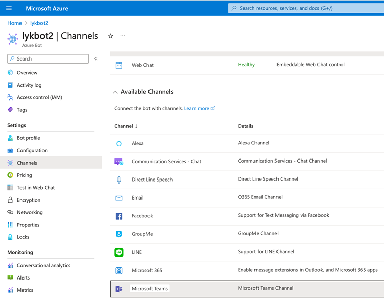 Dans le volet droit, cliquez sur Microsoft Teams pour ajouter votre bot. Vous devrez peut-être faire défiler vers le bas pour voir la liste de toutes les chaînes disponibles.