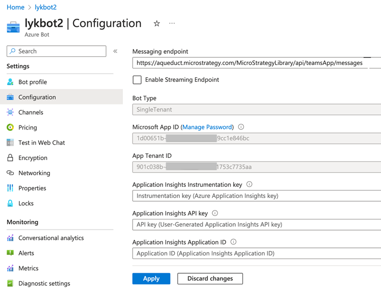https://<Your URL of Strategy Library>/api/teamsApp/messages. Par exemple :https://aqueduct.microstrategy.com/MicroStrategyLibrary/api/teamsApp/messages.Assurez-vous que votre