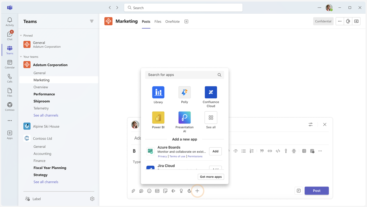 2. Si vous êtes dans un canal Teams, cliquez sur Extension de message (+) dans la barre d'outils inférieure et sélectionnez Strategy Application Teams.