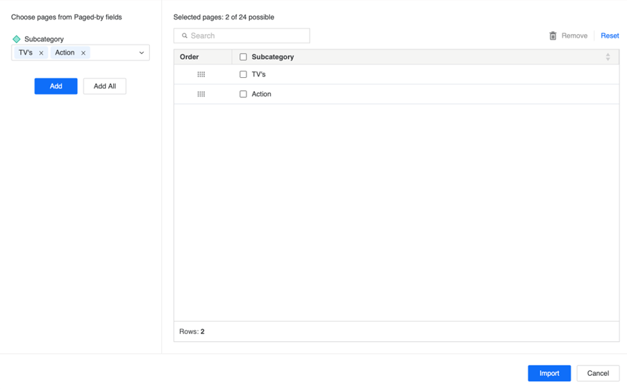 - Fare clic su Aggiungi per aggiungere l'oggetto selezionato o Aggiungi tutto per aggiungere tutte le varianti disponibili per gli oggetti raggruppamento a pagine nel report.