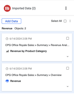 - Per dataset, cubi e report, selezionare un oggetto e fare clic su Importa dati oppure scegliere Importa dati dall'elenco a discesa. Se si desidera affinare i dati, è anche possibile fare clic su Prepara dati.