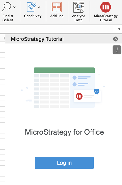 끝에 있는 전략 추가 기능을 클릭합니다. Microsoft Excel리본. MicroStrategy for Office사이드 패널에서 이(가) 열립니다.