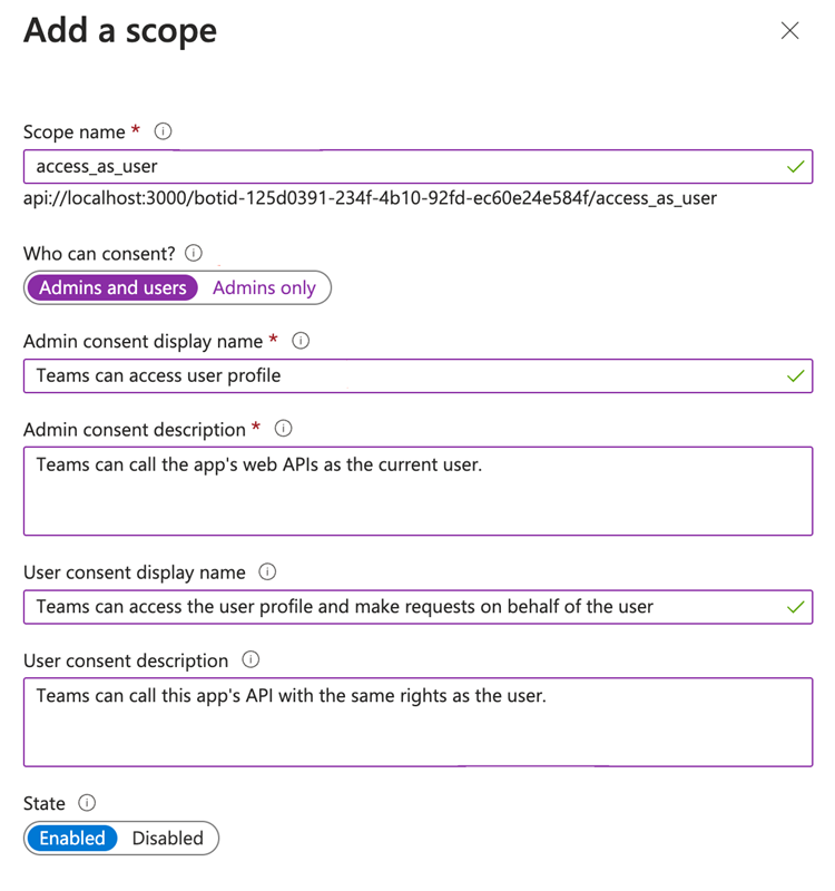 URI의 형식은 다음과 같습니다. api://<host name>/botid-<current application registration id>. 해당 "current application registration ID" 은(는) 애플리케이션(client) 개요의 ID입니다.