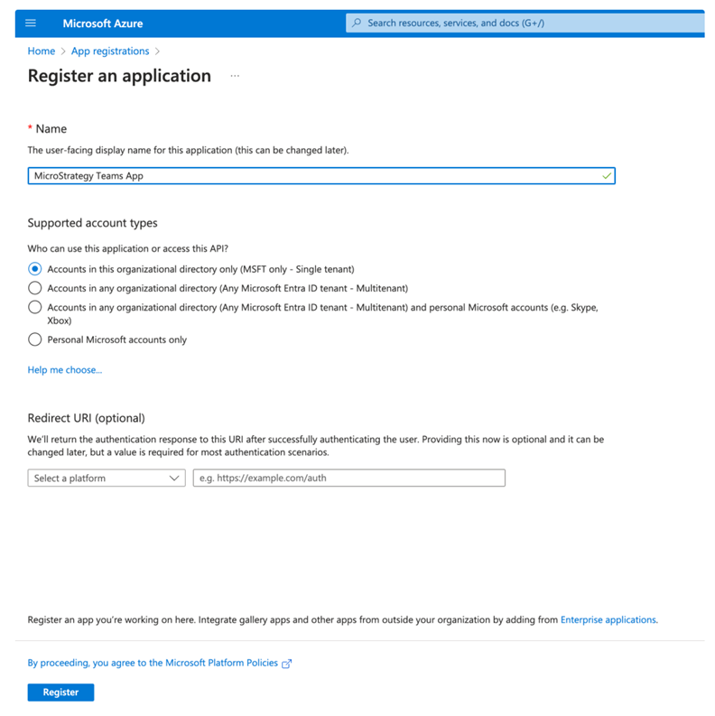 MicroStrategy ONE 에서 시작 (2024년 6월), MicroStrategy Teams 앱을 사용하려면 Azure AD를 구성해야 합니다. Teams의 애플리케이션 등록. 다음 단계에서는 고객에게 이미 애플리케이션을 생성할 수 있는 권한이 있는 것으로 간주됩니다. 등록.