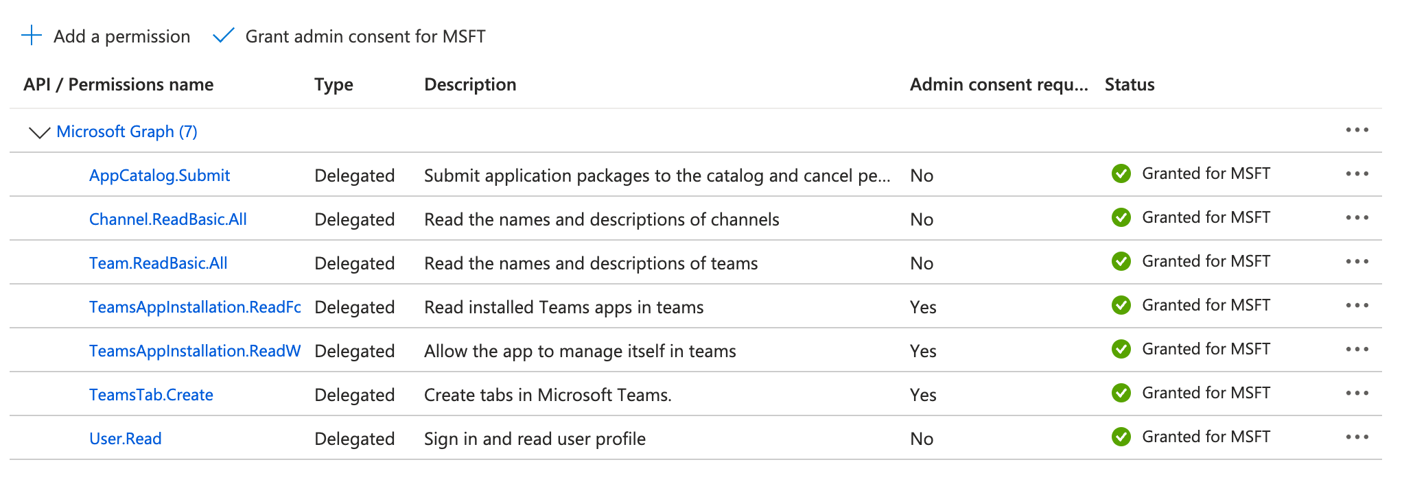 - 클릭 MSFT에 대한 관리자 동의 부여및상태모든 권한 /개가 (으)로 설정됨 MSFT에 대해 부여됨 .