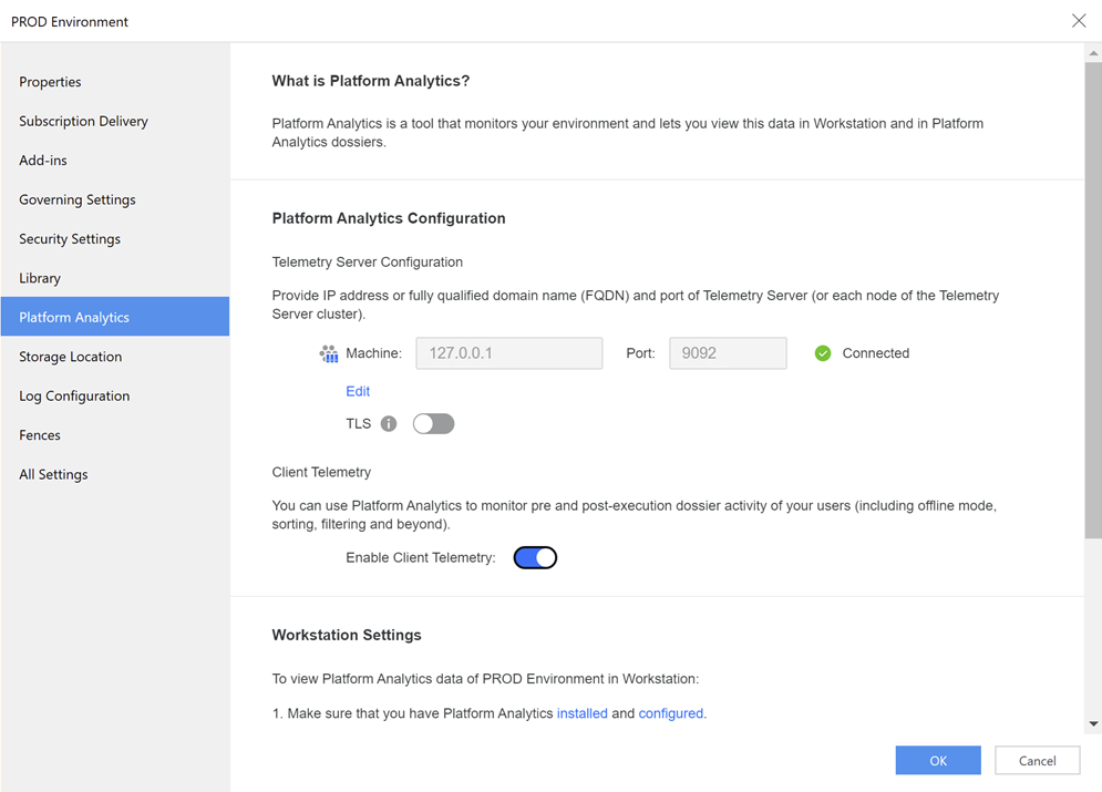 - In Workstation > Umgebungen > - Eigenschaften > Platform Analytics, stellen Sie sicher, dass der Status des Telemetry Servers verbunden ist.