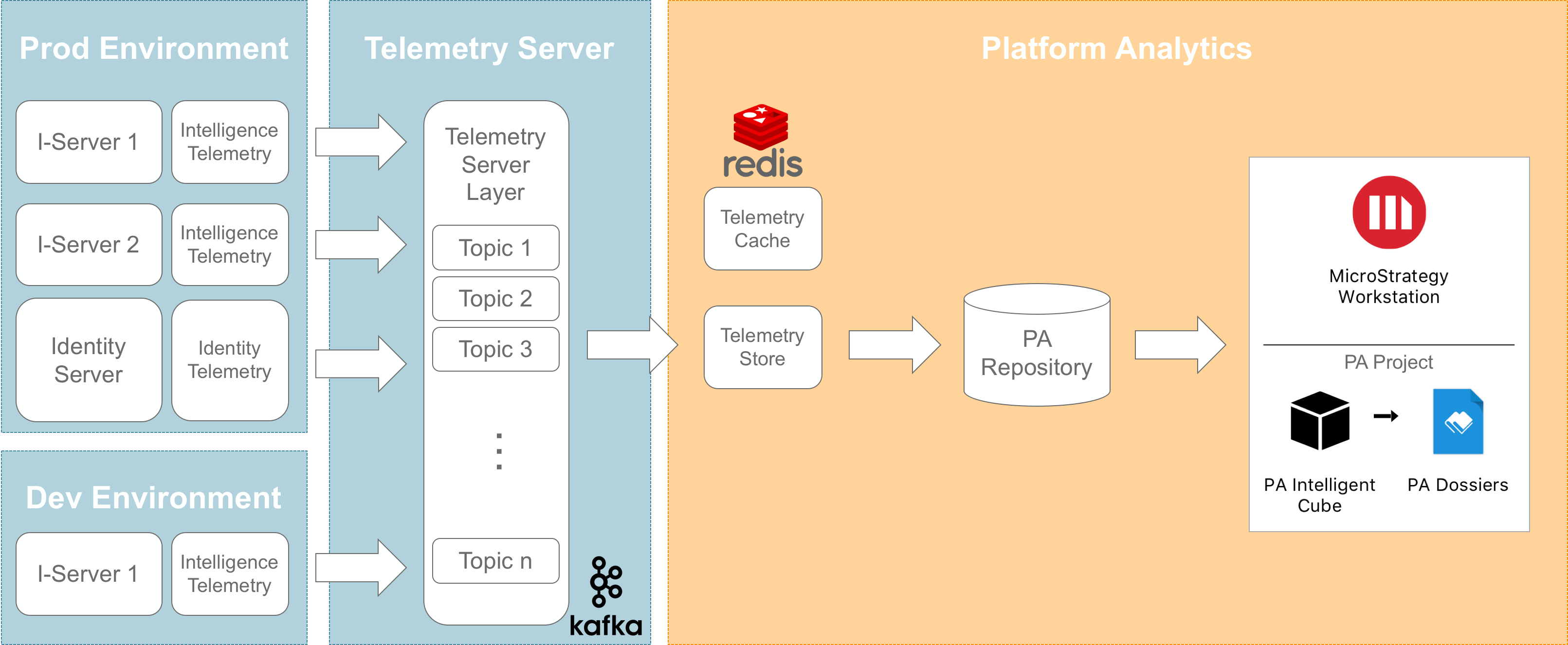 - Platform Analytics 저장소: 이 데이터 웨어하우스는 Telemetry Store에서 처리한 모든 MicroStrategy 원격 측정을 저장합니다. 그런 다음 이 데이터는 Platform Analytics 프로젝트에 포함된 대시보드에서 사용됩니다.