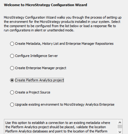 모든 메타데이터에서 Platform Analytics 프로젝트를 만들 수 있습니다. 구성 마법사를 사용하거나 Platform Analytics로 모니터링할 Intelligence Server 시스템의 응답 파일을 사용하여 프로젝트를 만들거나 메타데이터에 추가합니다.