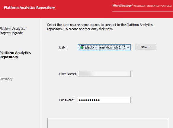 안에 있음 DSN에서 Platform Analytics 저장소를 선택합니다. 경우 DSN이(가) 표시되지 않으면 을(를) 클릭합니다. 신규을(를) 클릭하여 선택한 Platform Analytics 저장소에 연결하는 새 DSN을 만듭니다.
