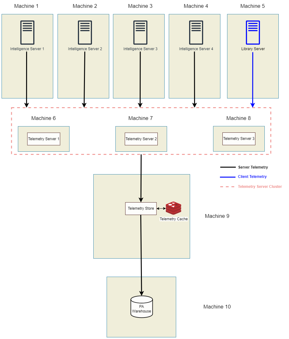 在这种配置中,所有 Platform Analytics 组件都安装在同一台机器上。必须配置所有图书馆和情报服务器环境(单个节点或集群)以在同一个遥测服务器节点上生成数据。Platform Analytics 仓库由开箱即用的MicroStrategy 存储库。
