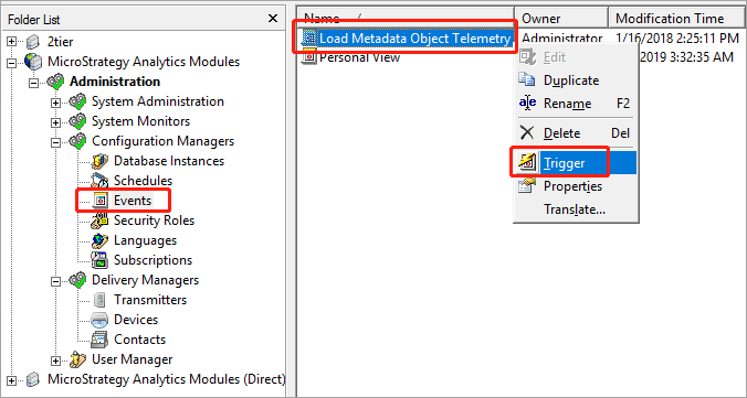 - 在管理 > 配置管理器 > 事件下,右键单击 Load Metadata Object Telemetry(加载元数据对象遥测)事件,然后选择触发。