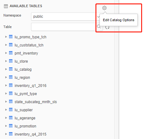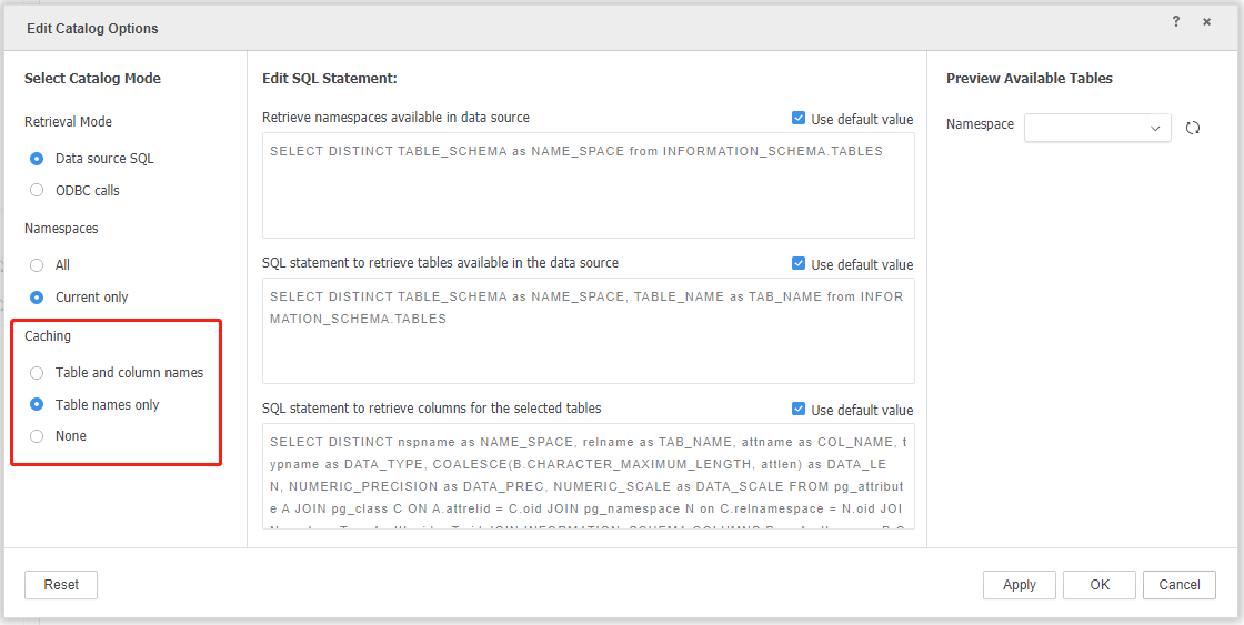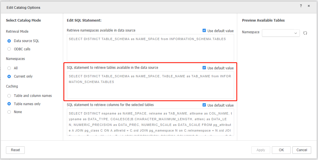 Modify the default SQL statement to retrieve tables as shown below. Changes to the default SQL statement impact column retrieval for the project schema.
