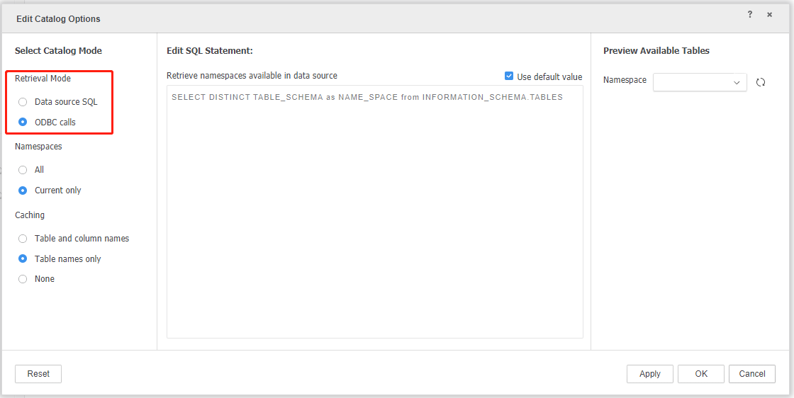 Under Retrieval Mode, select Data source SQL to allows the default SQL statement to retrieve tables available in the data source. Changes to the SQL statement impact column for data import.
