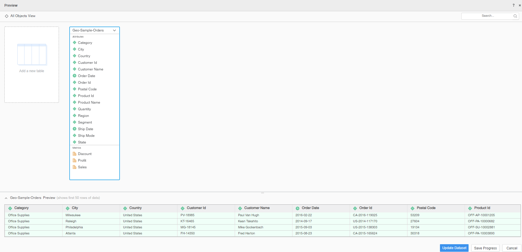 This business user scenario is about a sales record and order returned by a customer. The lookup table is the order return table, which is imported as an in-memory cube named DataBlendingLookUpTable.