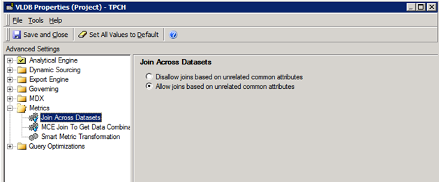 - Disallow joins based on unrelated common attributes: By default, data is not joined for unrelated attributes that are included on the same dataset. This option is to support backward compatibility.