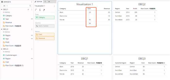 This option disallows joins based on unrelated common attributes, so if you add two metrics from two different datasets, the result appear as shown below. Since the option to do cross joins is disabled, this allows a DBCJ2 and DBCJ3 join on Region and then join with DBCJ1 on Year to get the Category and Cost.