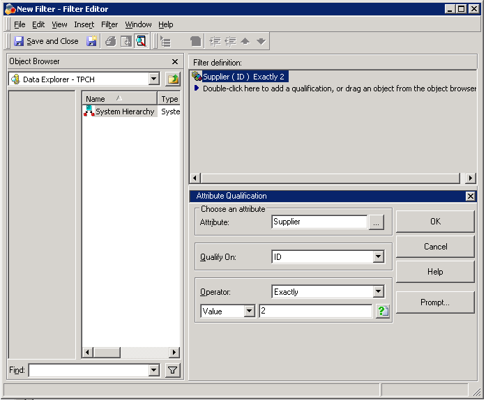 A filter is a MicroStrategy object that specifies the conditions data must meet to be included in report results. Using a filter on a report narrows the data to consider only the information that is relevant to answer your business question, since a report queries the database against all the data stored in the data warehouse. A filter is composed of at least one qualification, which is the actual condition that must be met for the data to be included on a report. Multiple qualifications in a single filter are combined using logical operators. A filter is normally implemented in the SQL WHERE clause. You could create stand-alone filter or report filter.