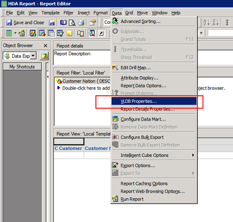 In Developer, choose Data > VLDB Properties.