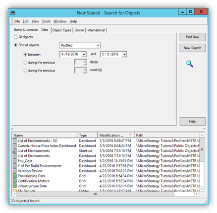 Click Find all objects to search for an object based on the date or time frame of when it was modified.