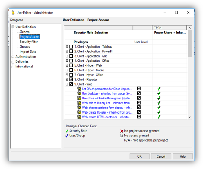 MicroStrategy employs over 160 privileges to assign application functionality to users, user roles, and user groups through a graphical interface, and through text-based commands that can be run in batches with Command Manager.