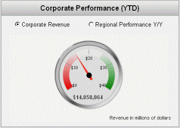 The image below is an example of a gauge graph that is used at the top of a document to highlight corporate revenue and regional performance.