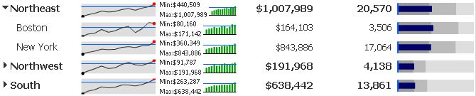 In the image below, rows are grouped by the Region attribute. The Northeast group is expanded to display the elements of the Call Center attribute, with the rows Boston and New York. You can accommodate up to ten attributes in the tree display.