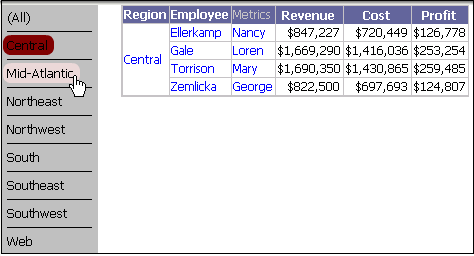 In all modes, an item that the cursor is pointed at is displayed in a lighter shade of the selected item's background. In the Flash Mode example directly above, Mid-Atlantic is displayed with a pink background, while the Interactive Mode example displays Northwest in a light blue.