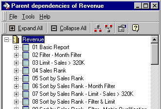 - From the Tools menu, choose Object used-by dependencies. The Used-by dependencies dialog box opens and displays a list of objects that depend on the selected object for part of their definition. The image below shows some of the used-by dependencies for the Revenue metric in the MicroStrategy Tutorial project.