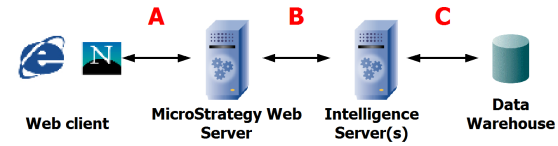 The ability of the network to quickly transport data between the components of the system greatly affects its performance. For large result sets, the highest load or the most traffic typically occurs between the data warehouse and the Intelligence Servers (indicated by C in the diagram below). The load between Intelligence Server and Web server is somewhat less (B), followed by the least load between the Web server and the Web browser (A).
