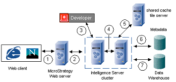The various components of the MicroStrategy system need to be installed on different machines for performance reasons. The network plays an important role in connecting these components. In the diagram below, the separate components of the MicroStrategy system are linked by lines representing the network. The steps that occur over each connection are described in the table below the diagram.