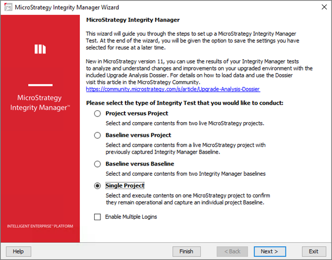 Lorsque vous procédez à la mise à niveau vers Strategy ONE, vous devez vous assurer que les rapports, les documents de services de rapport et les tableaux de bord renvoient les mêmes résultats dans l'environnement actuel et dans l'environnement mis à niveau. Pour les clients qui effectuent une mise à niveau parallèle, la façon la plus simple de procéder est d'utiliser le test « Projet contre projet » qui exécutera les objets de contenu sélectionné par rapport à deux environnements, l'un votre production existante et l'autre votre environnement de mise à niveau de test. Les clients qui effectuent une mise à niveau sur place doivent créer une ligne de base de projet pour votre environnement de production actuel, puis, une fois la mise à niveau terminée, utiliser cette ligne de base pour exécuter l'option « Base de référence contre projet ». Les étapes ci-dessous fournissent un exemple.