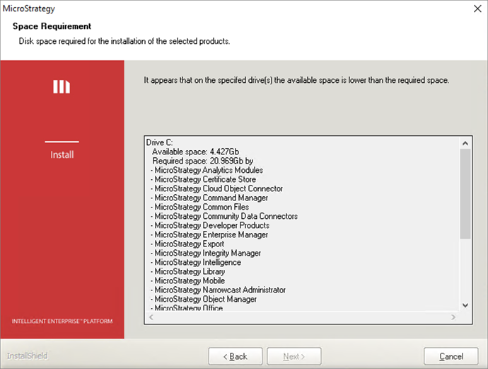 インストーラーは、システム上に十分なディスク空き容量があるかどうかを確認します。空き容量が不足している場合は、満たしていない要件が表示され、アップグレードが中断します。