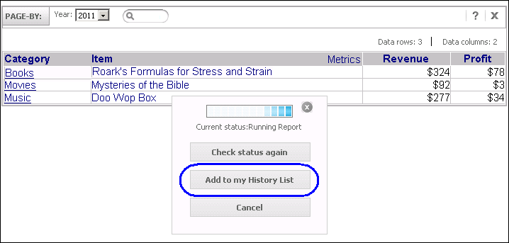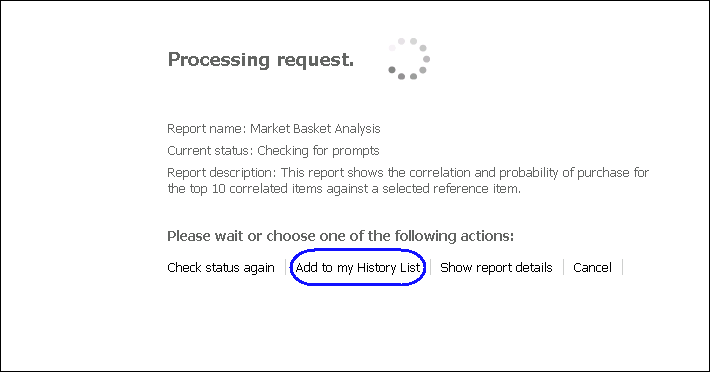 In this scenario, you remove the "Add to my History List" link or button from the Processing page that is displayed when a report is being executed or manipulated. The Processing page displays the status of page-specific actions such as running a report, checking for prompts, or performing a search. You perform this customization by setting the value of the flag that determines which links to display on the Processing page.