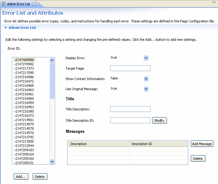 This setting corresponds to the properties and values defined for the <errors> node in the adminErrors.xml file located in WEB-INF\xml\config inside the MicroStrategy Web installation folder. The errors configuration file lists all of the errors or special conditions that can occur in the application.