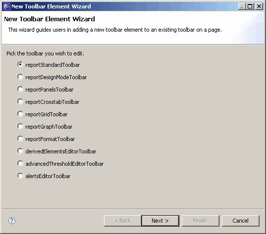 The New HTML Toolbar Element Wizard adds a toolbar item to an existing toolbar. This toolbar is used when MicroStrategy Web is launched in HTML mode.
