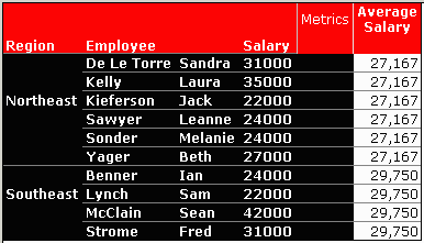 Example 2: This report obtains the average salary for employees in each region. The report contains the attributes Region, Employee, and Salary as well as the metric Average Salary. A report filter limits the regions displayed to Northeast and Southeast. The metric Average Salary is defined as follows: Avg(Salary){Region}