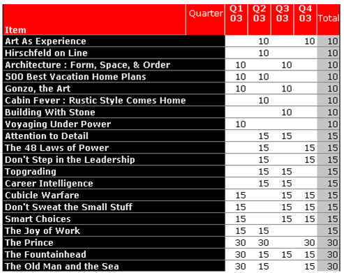 The First function is often used to define subtotals. In this example, the First function defines the subtotal for the metric units received, returning the units received for the first quarter containing a value in 2003. The expression defines the subtotal as follows: