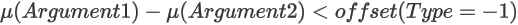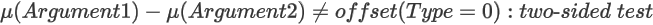 HeteroscedasticTTest or HomoscedasticTTest <Hypothesis type, offset> (Argument1, Argument2)