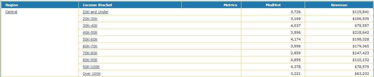 This example shows a report to find the median Revenue per Customer for each Income Bracket in the Central Region.