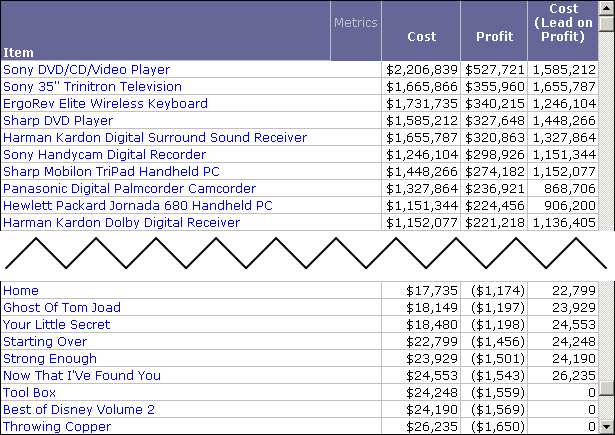 The Cost (Lead on Profit) values are displayed three ahead of the Cost metric, and are displayed based on the descending sort order of Profit. Notice that with an offset of three, the last three entries for Cost (Lead on Profit) use the default value of zero. Also, the first three values of Cost are not included in the Cost (Lead on Profit) metric.