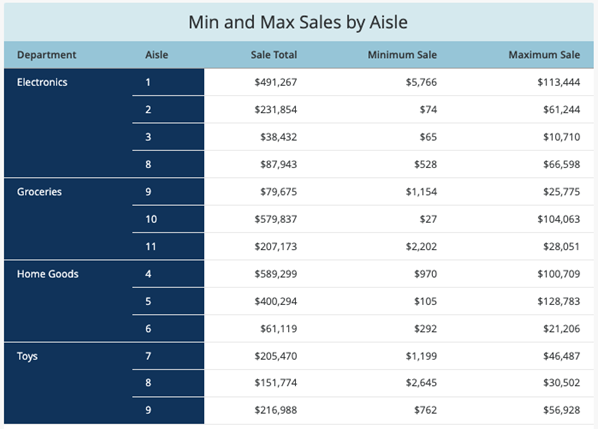 The metric is placed on the grid with the attributes Department and Aisle and the metrics Sale Total and Minimum Sale. The resulting grid appears as follows: