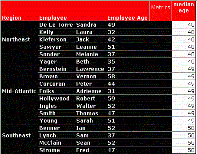 This example shows a report built to obtain the median age of employees within each region. The report includes the attributes Region, Employee, and Employee Age, and the metric Median Age. A report filter limits the regions displayed to Mid Atlantic, Northeast, and Southeast. The metric Median Age is defined as follows: