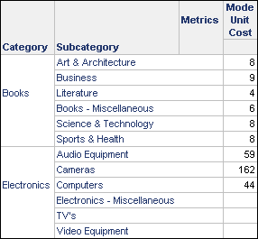 This example shows a report that retrieves the mode of the unit cost for items in a subcategory. The report returns the most frequently repeated unit cost within the various subcategories, and, in the cases of Electronics, TVs, and Video Equipment, it returns a NULL value, because there are no recurring unit cost values for them. The report contains the attributes Category and Subcategory, and the metric Mode Unit Cost. A report filter limits the categories displayed to Books and Electronics. The Mode Unit Cost metric is defined as follows: