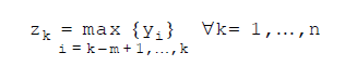 This simple example illustrates how the MovingMaximum function moves through a list of values, subtracting a value from the user-defined number of preceding rows. In this case, the window size is set to 3, meaning that the value in the MovingMaximum column represents the highest value among the current and preceding two values in the value list. The calculation is shown in the following table.