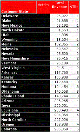 Example 2: This example shows a report where the customer states were sorted based on revenue and then divided among a specified number of buckets. The number of buckets is defined as 8. The report includes the attribute Customer State and the metrics Total Revenue and NTile. The NTile metric is a derived one, the syntax for which is as follows: