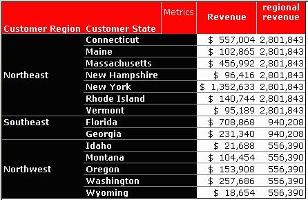 This simple report uses the attributes Customer Region and Customer State, and the metrics Revenue and Regional Revenue to generate a report showing the sum of the revenue for several regions. A report filter limits the regions displayed to Northeast, Northwest, and Southeast.