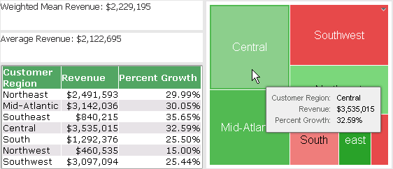Notice that while the Average Revenue and Weighted Mean Revenue are applicable to a year in this example, the values are displayed for every Customer Region row. One way to simplify the display of this information is to include this data on a dashboard. You can include the Average Revenue and Weighted Mean Revenue results in text fields along with additional visualizations of the data, as shown below.