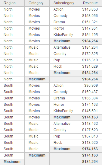 Beachten Sie, dass die zwei Metriken „Maximaler Umsatz“ unterschiedliche Werte zurückgeben. Die Metrik „Max. Umsatz (Visualisierung)“ gibt den Maximalwert des Umsatzes aus der Visualisierung zurück. Das heißt, die Metrik ist die Auswahl zwischen den zwei Umsatzwerten für jede Region. Die Metrik „Max. Umsatz (Basis)“ gibt den maximal zulässigen Umsatzwert auf der Ebene der Unterkategorie (die die Ebene des Datensatzes oder der Basis ist) zurück, genau wie die in der vorherigen Tabelle berechneten Zwischensummen.