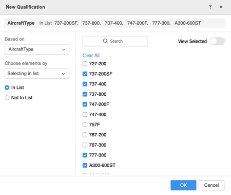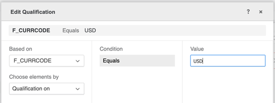 Sie müssen den Eingabewert für die Filterdefinition definieren. Die Spalten verfügen über eine obligatorische Filterbedingung (Gleich), die im Dialogfeld „Qualifizierung bearbeiten“ festgelegt werden muss.