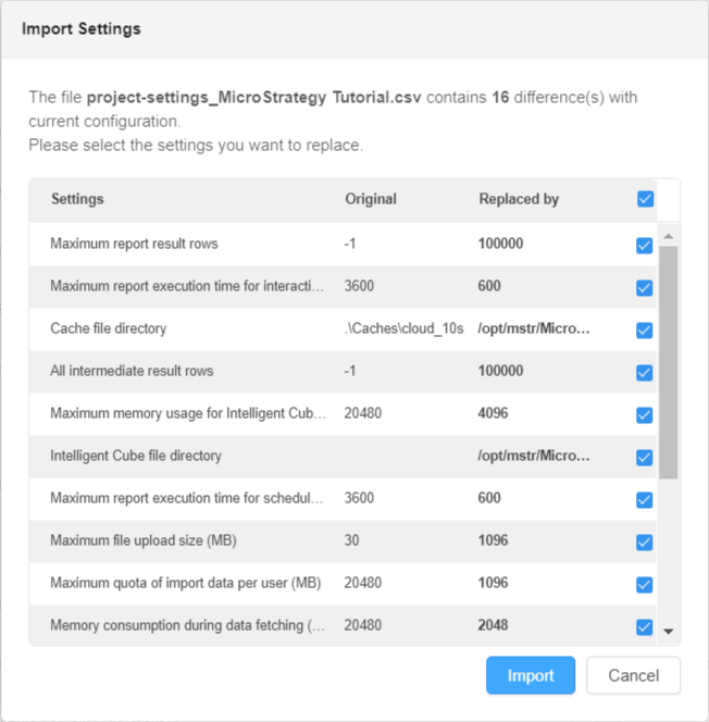 Administrators can export project-level settings to a .csv file and import them for use with another project.